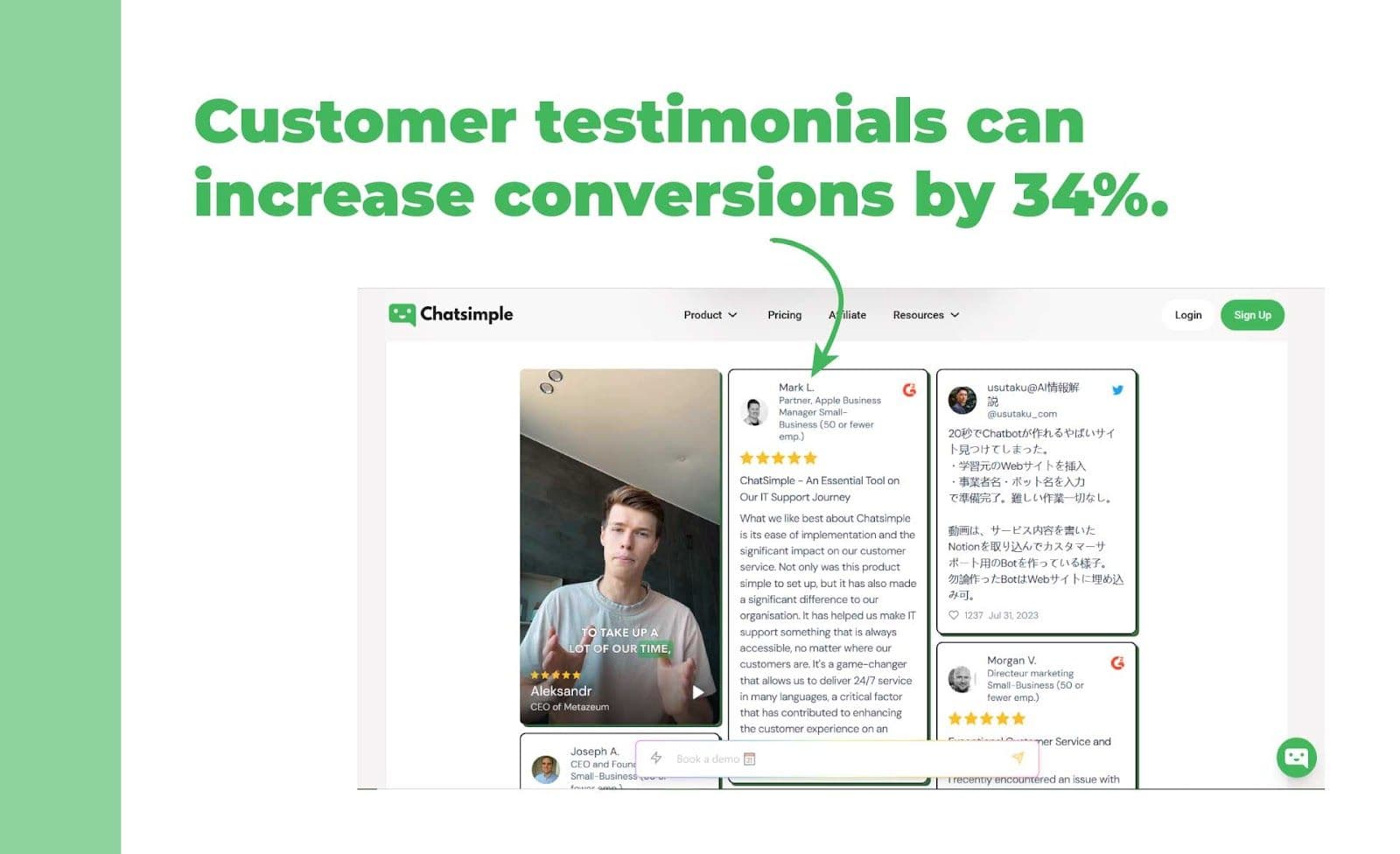 1. Customer testimonials: It can increase conversions by 34%. Just feature quotes from your satisfied customers highlighting their positive experiences with your product or service.