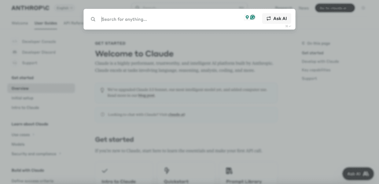 Anthropic's documentation showcases the power of AI search through Claude's integration. Rather than scanning through multiple pages, users can ask natural language questions about API implementation, model capabilities, or best practices, and receive contextually relevant responses drawn directly from Anthropic's documentation.