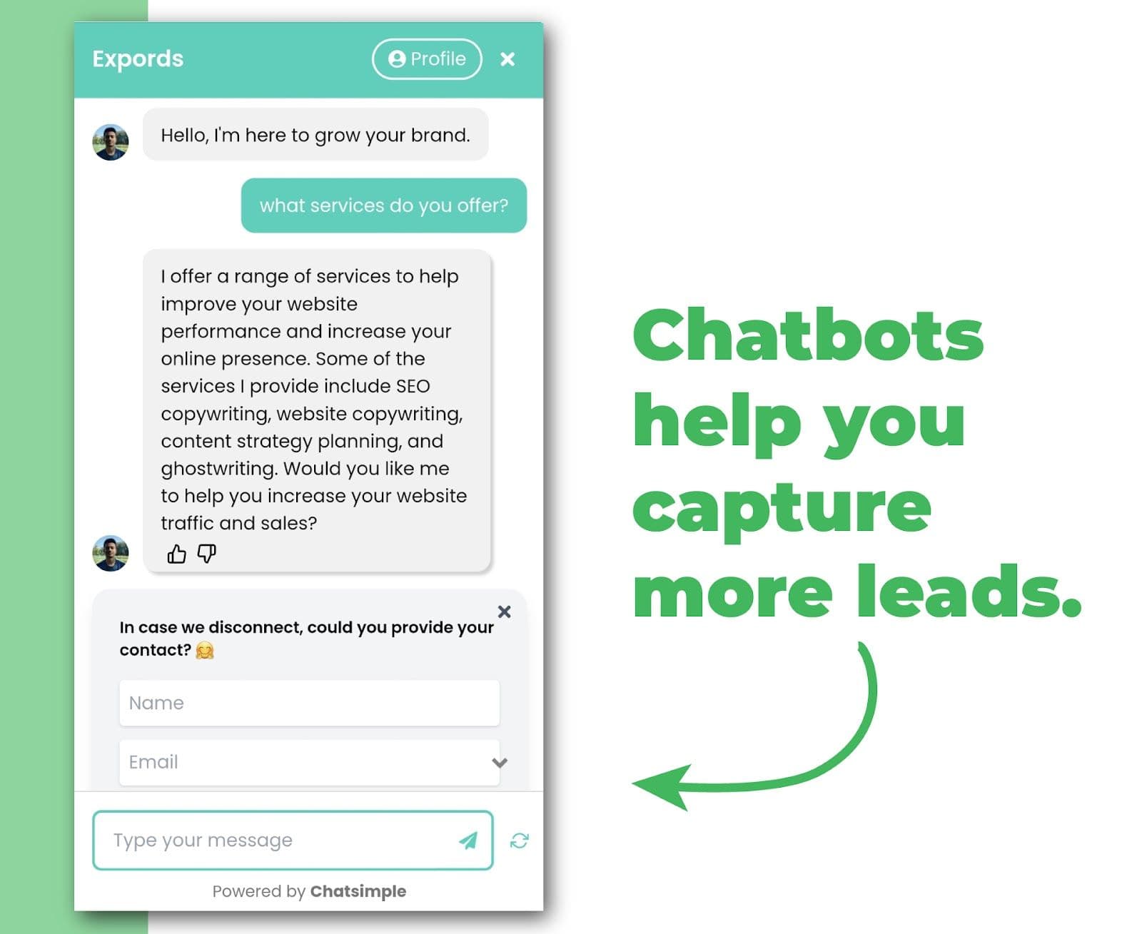 AI chatbots are basically your digital assistants that know your business inside out. They offer personalized and human-like answers to customer queries to collect leads.