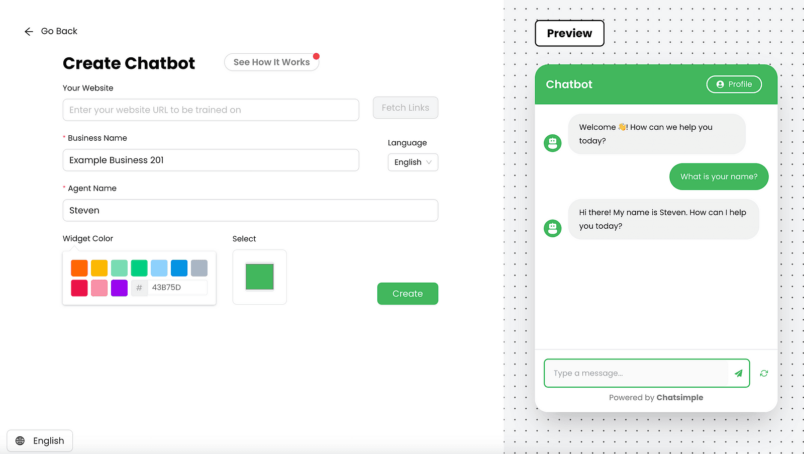 Simply add your website URL, along with some other information like Business Name, Language, and so on, and create your first chatbot.