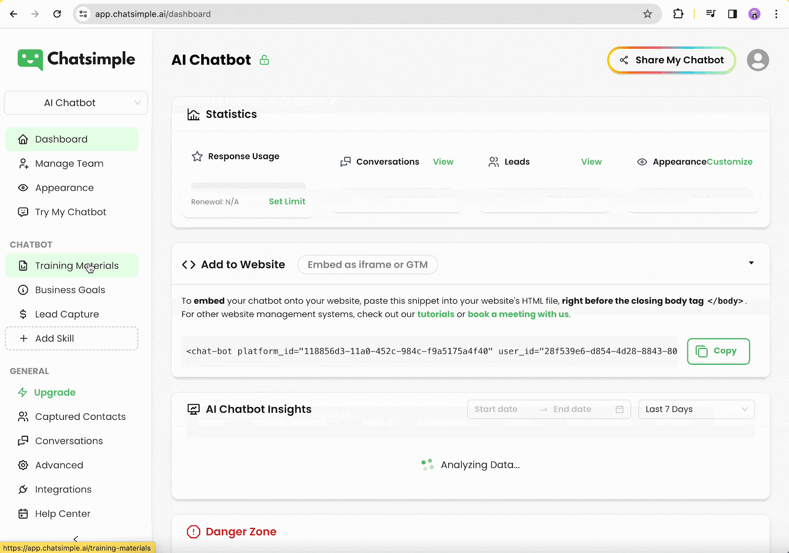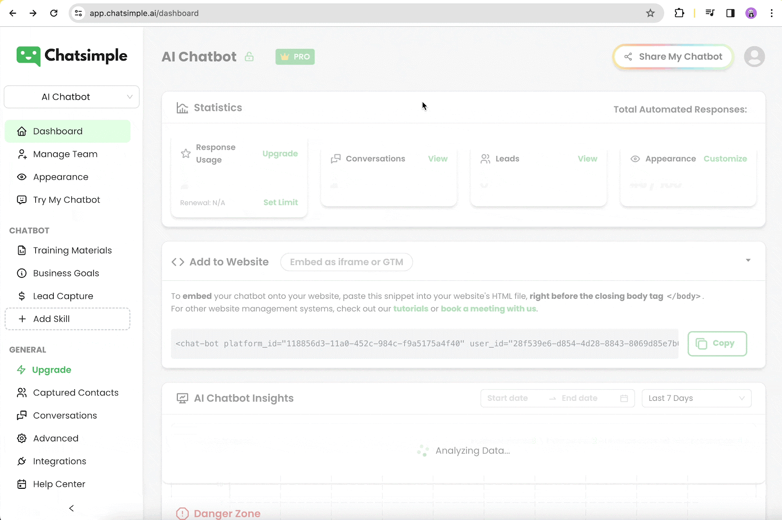 You can view various useful parameters such as response usage, conversations, leads, and more.