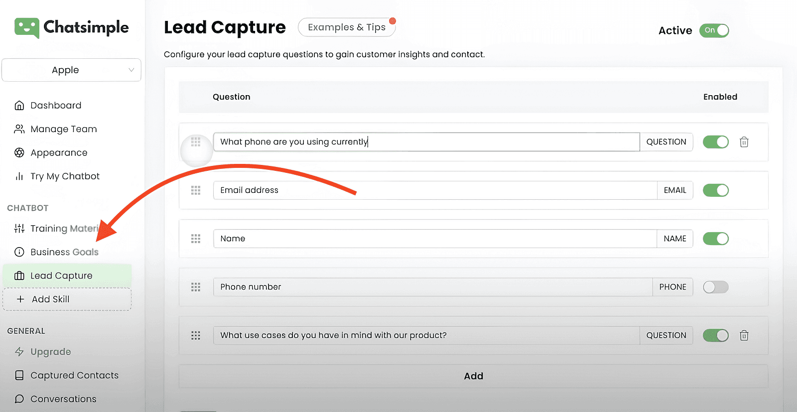 For that, simply visit the “Lead Capture” tab, add the questions you want to ask, and click on save.