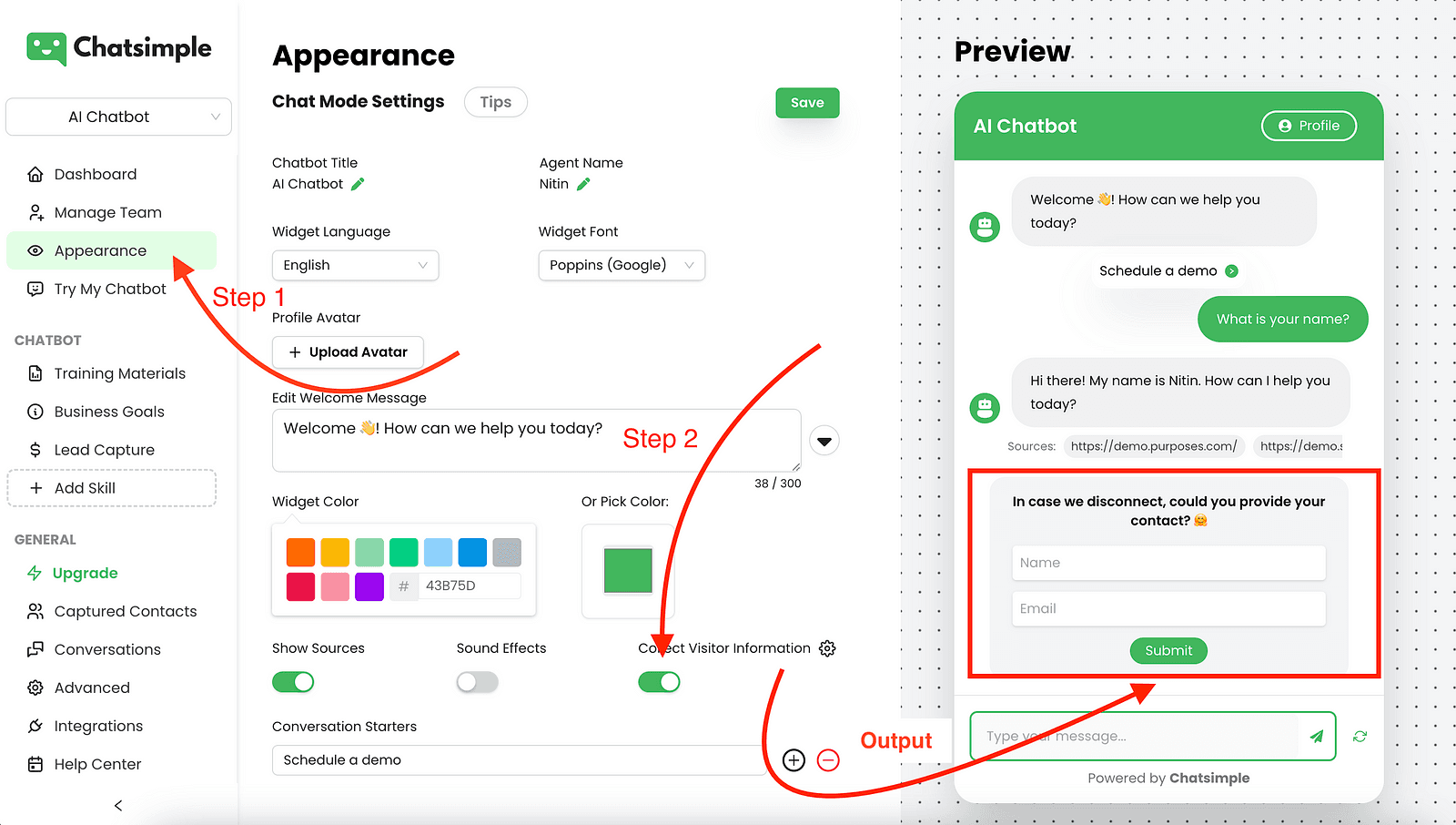 To add the contact info, simply visit the Appearance tab, select “Collect Visitor Information,” and then new contact info can be added.