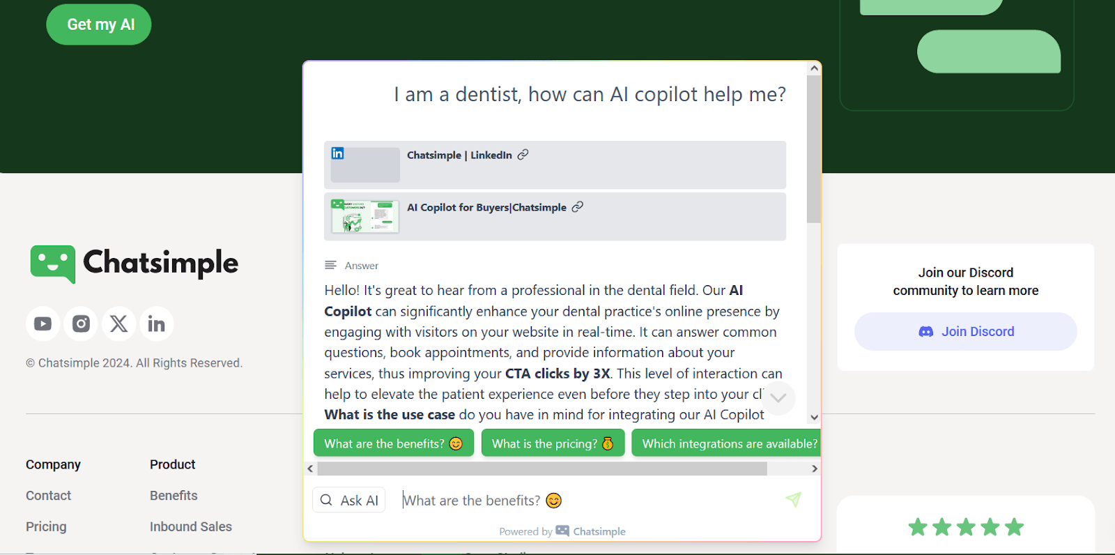 AI Copilot for website visitors understands your business in depth. It can recommend your products and explain what they do. It can tell the primary benefits of your products in a concise and compelling way.