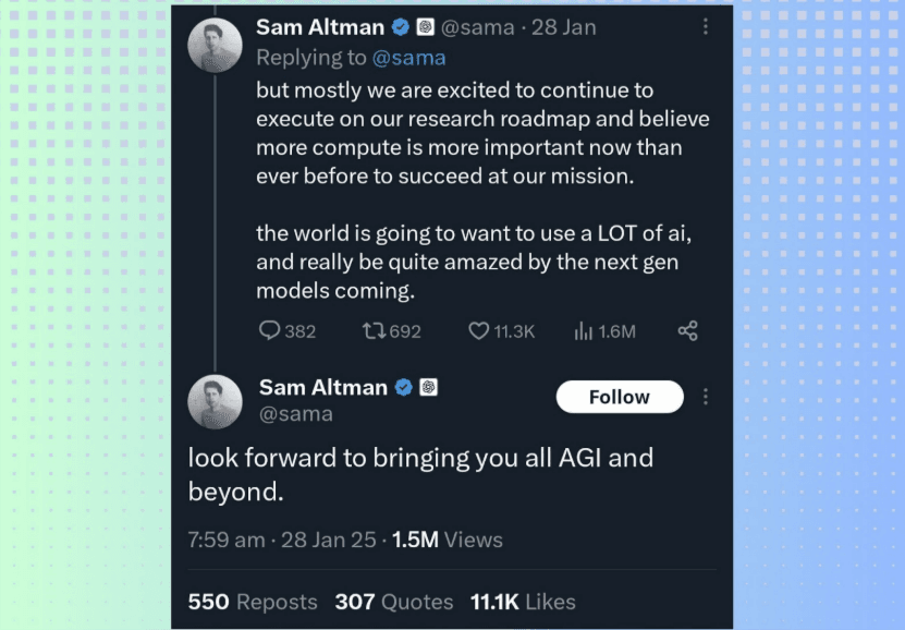 AGI or Artificial General Intelligence is a type of AI that matches the cognitive abilities of humans. With this technology, machines can learn any skill, understand emotions, and solve complex problems. Altman confirmed they’ll bring AGI, promising that the next-generation models will “amaze the world.”