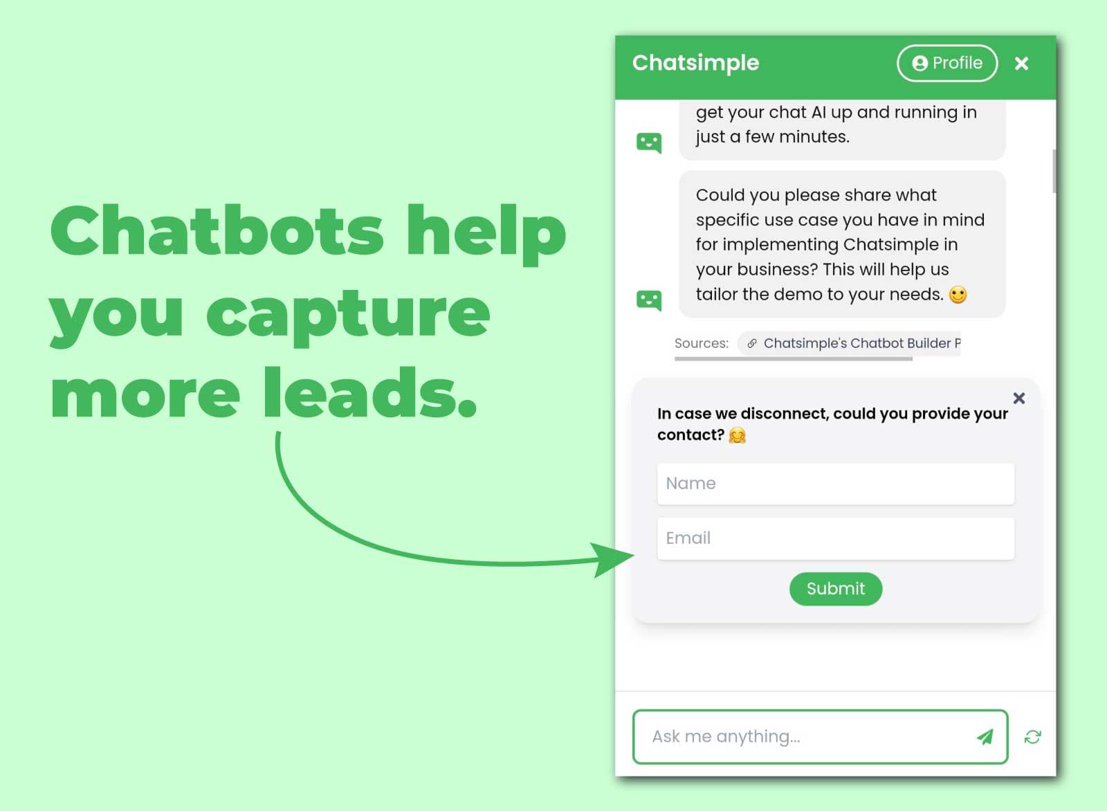 These bots ask a set of lead generation questions to effectively qualify potential leads. Then, they smoothly bring up a contact form and ask visitors to share their contact info.