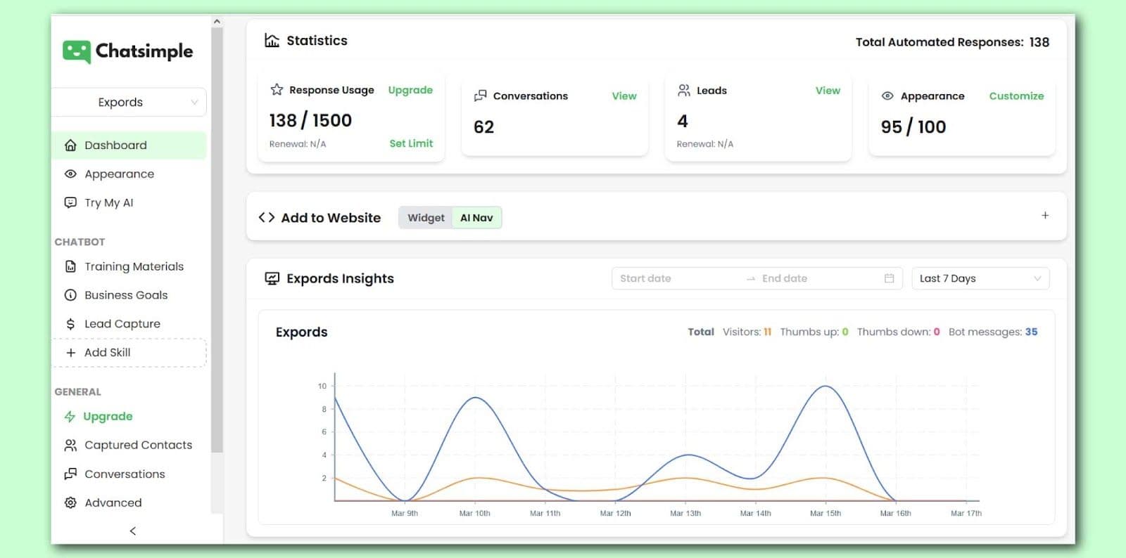 At the same time, the dashboard should show clear metrics on how your chatbot is performing. This includes things like total conversations, number of lead captures, etc. This way, you can continuously optimize the bot for maximum impact on your business.