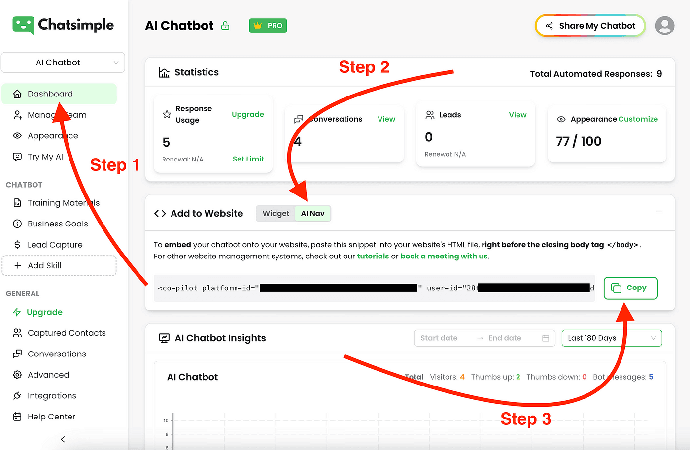 Visit the Dashboard panel, switch to the AI Nav tab, and then copy the snippet and paste it on your website.