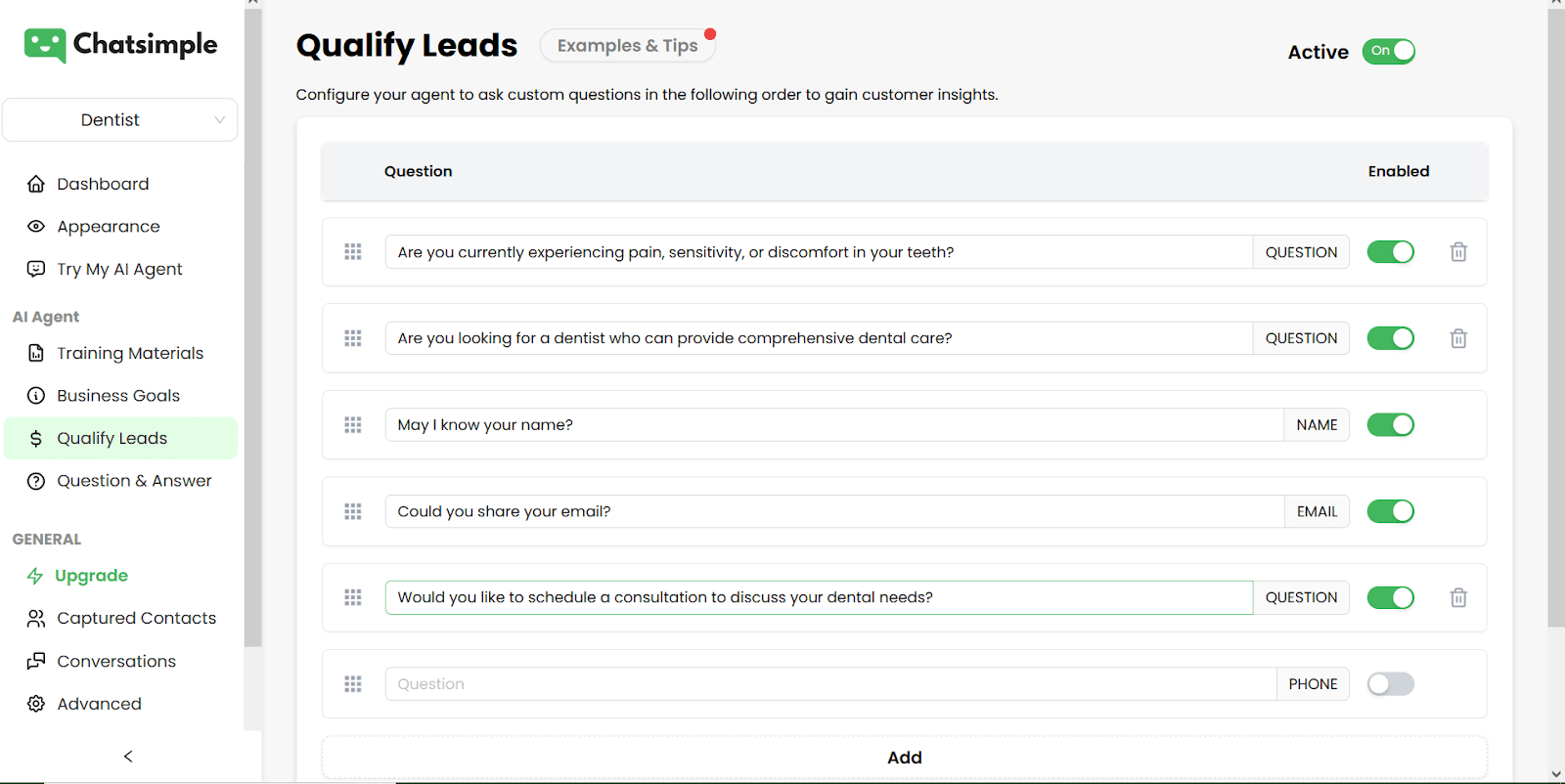 Por ejemplo, si eres dentista, puedes establecer preguntas de captura de clientes potenciales para el agente de ventas de IA de Expertise de esta manera: