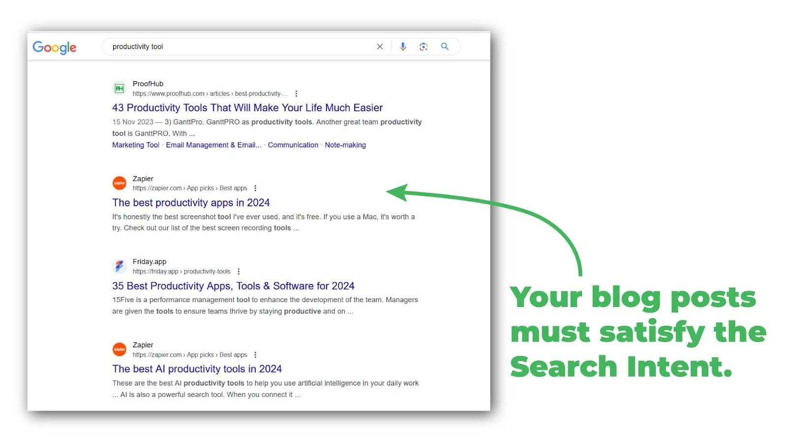 Si vous recherchez « outil de productivité » sur Google, vous verrez que les résultats sont dominés par des recherches qui fournissent une liste des meilleurs outils de productivité. Ces résultats sont là parce que c'est ce que les gens recherchent. Maintenant, si vous écrivez un article expliquant ce qu'est un outil de productivité, il ne sera probablement pas en première page.