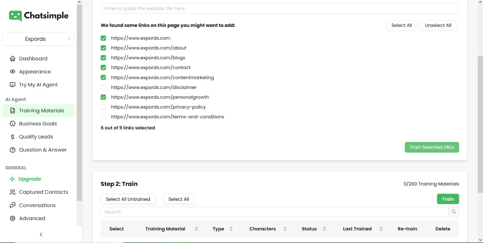 C'est tout. Maintenant, votre agent IA étudiera ces pages et apprendra tout sur votre entreprise. Vous pouvez également utiliser d'autres options de formation comme ajouter des fichiers, des sitemaps ou du texte simple.