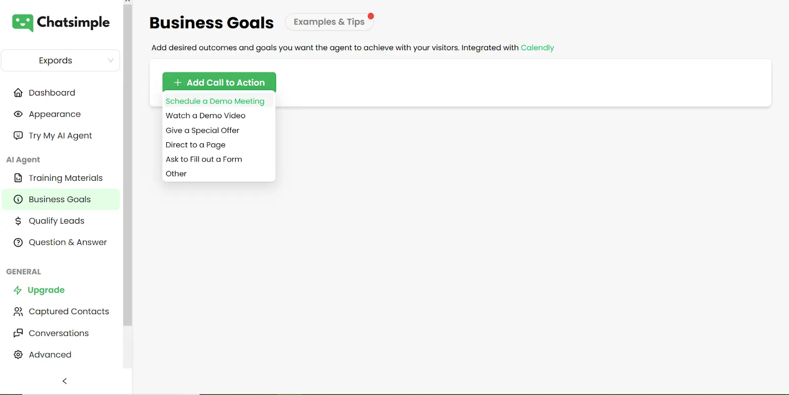 Vous pouvez faire cela en allant dans l'onglet Objectifs commerciaux. Ici, vous pouvez ajouter vos objectifs sous forme d'appel à l'action (CTA).
