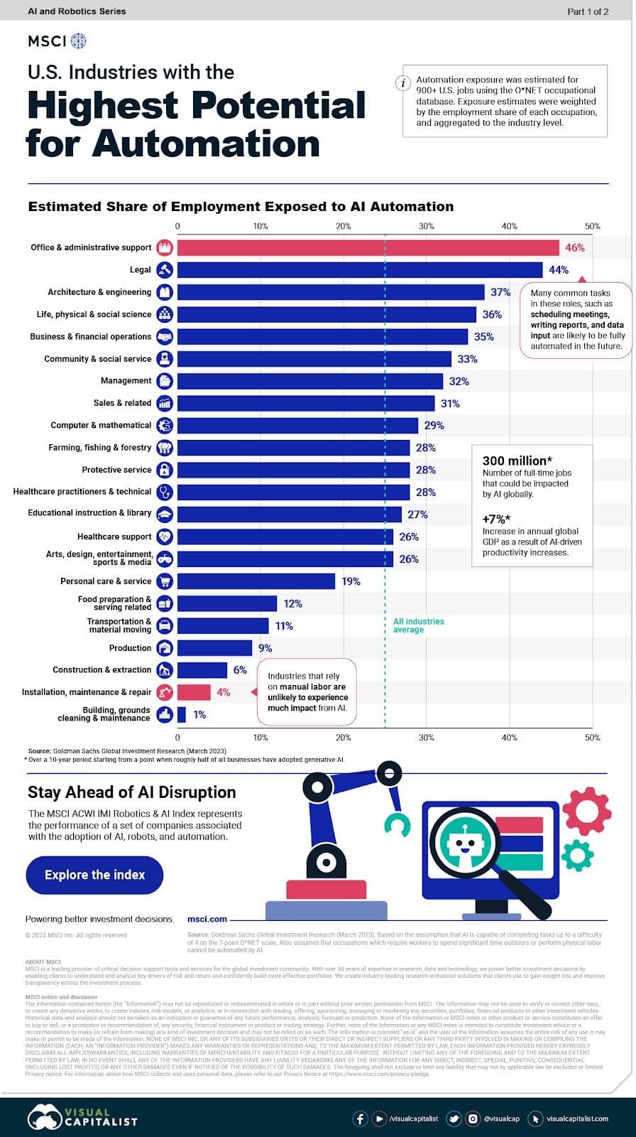 描述:这张信息图根据行业的AI自动化潜力进行排名,展示了最有可能受益于AI技术的行业,突出机器人和AI对各行业的影响及其自动化潜力。