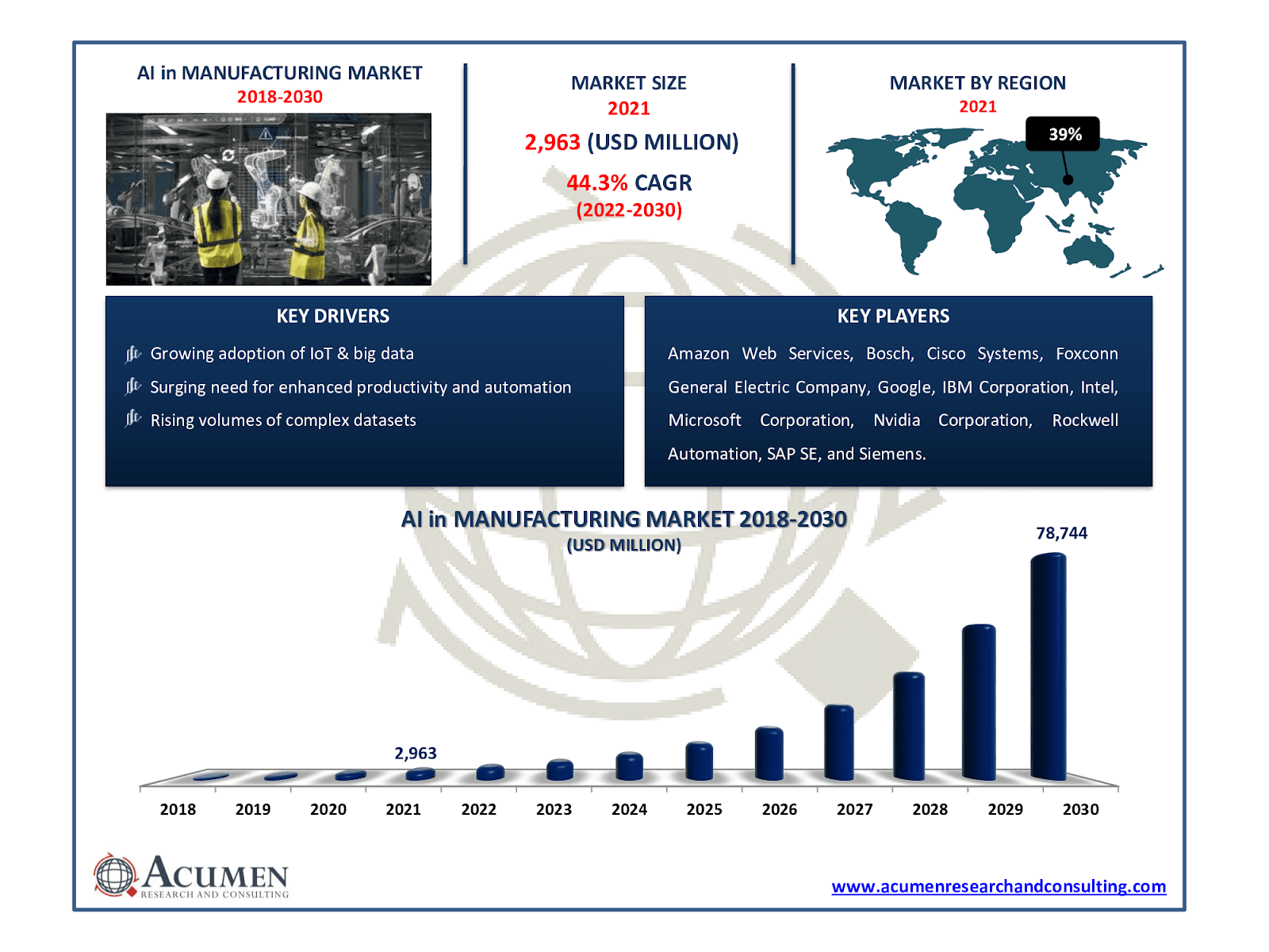 描述:这张图片提供了关于人工智能在制造业中的全球市场和到2030年的预测洞察。它强调了AI在制造业中的增长机会和潜在应用,展示了其对生产力、效率和自动化的影响。